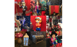 Décorations : livre géant, personnage Merlin, champignon géant, sucre d'orge géant, casse-noisette géant, lapins en résine, lapin géant en résine, chat en résine, singe en résine, horloge, sapins, lanternes, carte géantes, pièces échecs géantes, sol en damier, coffre, arbres géants, pommiers en fleurs, corbeau, flamant rose, fleurs artificielles, miroir, armure, chaudron, barrières en bois blanches, cheval blanc en résine, rondins de bois, personnage Princesse, arbres morts, arche..